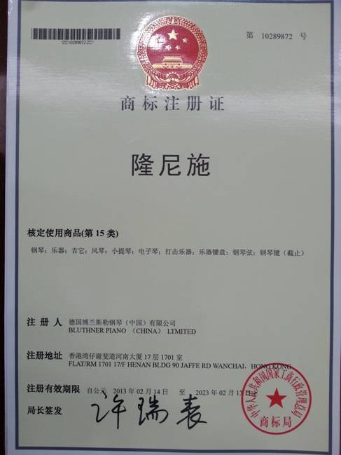 2013年9月德国博兰斯勒钢琴(中国)有限公司收到中国国家商标局颁发的“隆尼施”中文商标证书,商标证书编号为:第10289872号。德国Carl Rönisch钢琴的中文商标经过2年多时间的申请终于获得国家商标局的批准。德国博兰斯勒集团旗下德国“Carl Rönisch”钢琴品牌的中文名正式命名为:“隆尼施”;德国博兰斯勒集团旗下“Carl Rönisch Pianofortemanufaktur GmbH”中文名称改为:德国隆尼施钢琴有限公司。在此之前,因为“Carl Rönisch钢琴”在中国媒体报道和钢琴著作上的译音众多,有“劳力士、劳力斯、劳林士、隆尼斯、罗尼士等”,中文译名“劳力士”的认知度比较高。德国隆尼施钢琴有限公司在德国生产的全球著名钢琴品牌Carl Rönisch、Rönisch及Hupfled品牌。Carl Rönisch(隆尼施)品牌获得德国商会及德国联邦钢琴协会(BVK)共同颁发的的100%“德国制造”认证。