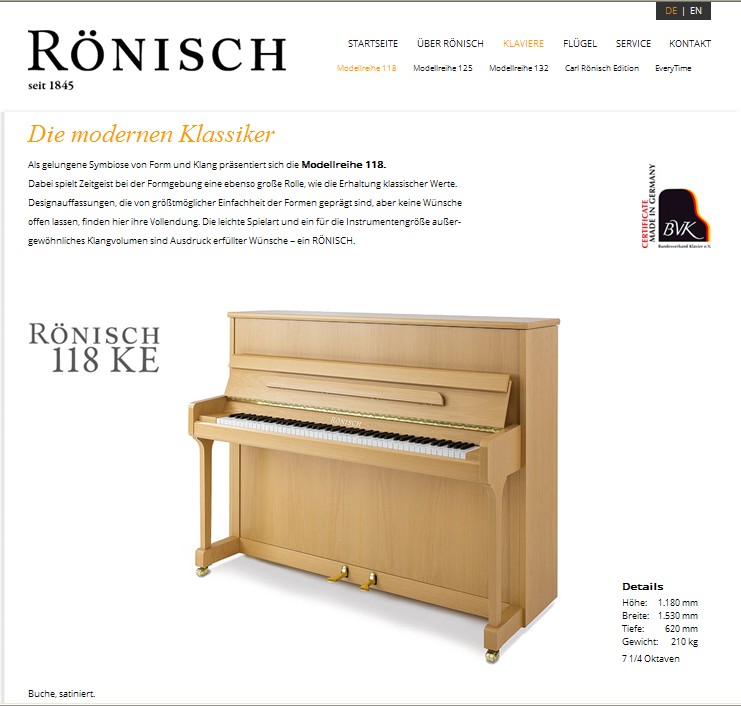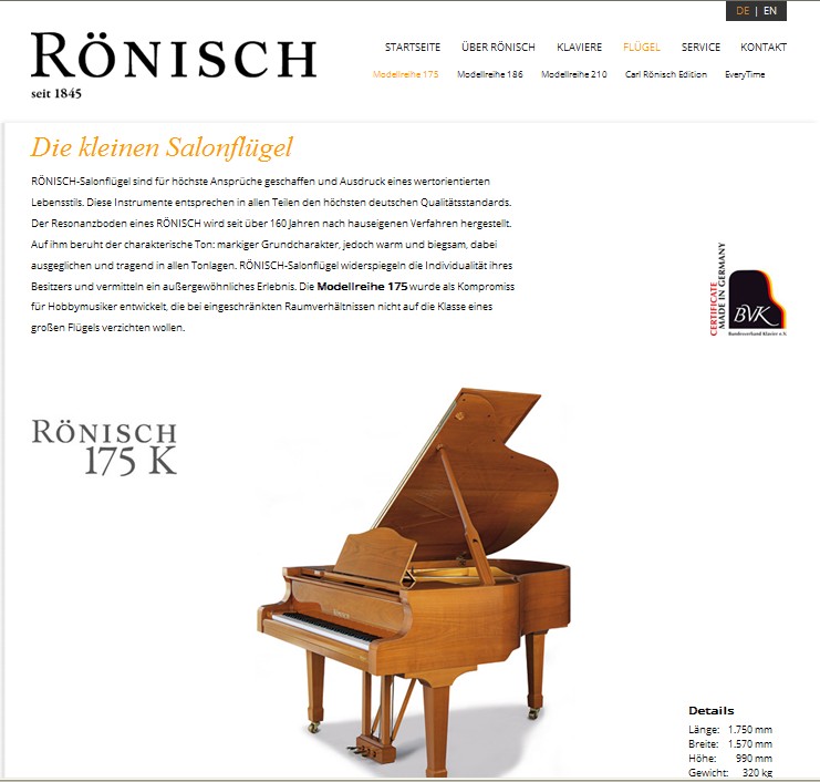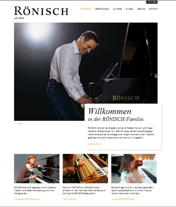 近日,CARL RÖNISCH钢琴的全新官方网站正式投入运行。http://www.roenisch-pianos.de/这次全新上线的CARL RÖNISCH钢琴官网包含了德语版和英语版两种语言。网站介绍了德国CARL RÖNISCH的历史沿革、立式钢琴、三角钢琴、售后服务介绍等相关具体内容。为了让广大音乐爱好者、专业人士能够更具体直观的了解CARL RÖNISCH钢琴,本次新建立的CARL RÖNISCH钢琴官网刊登了大量CARL RÖNISCH钢琴相关的宝贵图片,从其的历史、到生产厂房、生产设施、生产工艺,全都具体的展现在了所有爱好者面前。